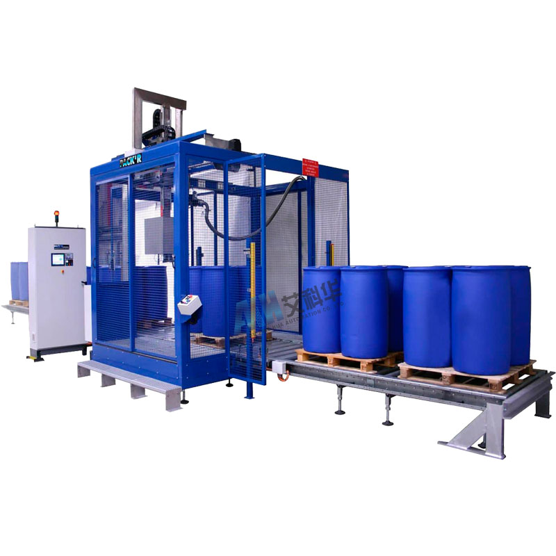 自動上桶——自動輸送——自動定位——自動開蓋——自動灌裝——自動封蓋——自動貼標——自動上棧板——自動堆棧排桶——自動滿桶輸送
